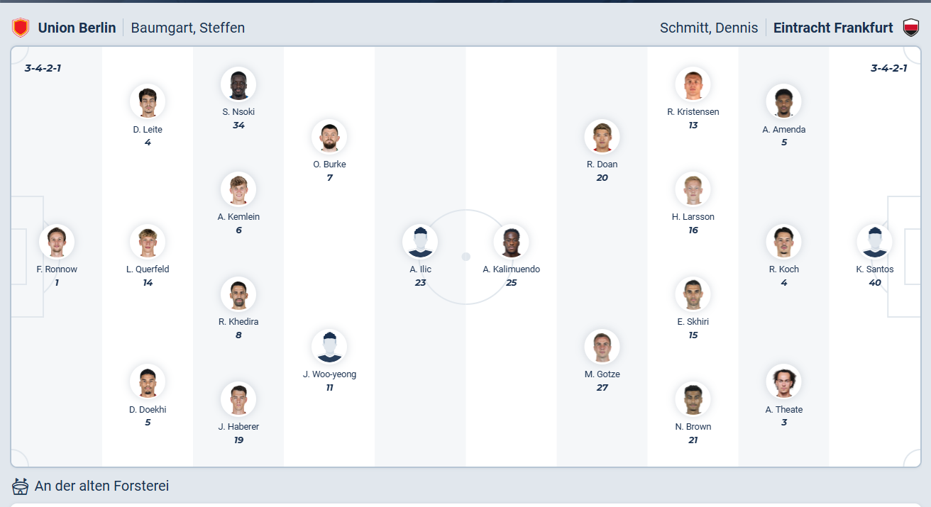 Frankfurt đang trải qua mùa giải vô cùng khó khăn, từ vị trí thứ 3 mùa trước họ đang đứng thứ 8 ở thời điểm hiện tại và phong độ vô cùng tệ hại. Đây là điều khiến ban lãnh đạo đội bóng này ra quyết định sa thải HLV, HLV Albert Riera lên nắm quyền với nhiệm vụ đưa đội bóng ra khỏi thời gian khó khăn và họ quyết tâm giành một kết quả tốt ở vòng đấu thứ 21 này. Tuy nhiên chuyến làm khách trên sân của Union Berlin không hề dễ dàng, nhiều khả năng Frankfurt sẽ không thể có khởi đầu tích cực với vị thuyền trưởng mới.
